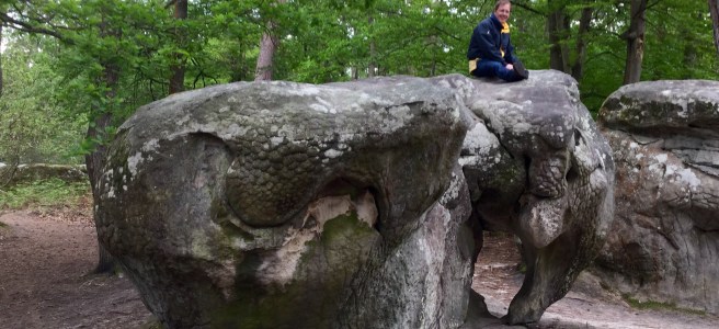 Barbizon’s fairy tale park is called the Fôret de Fountainbleu. It is filled with hundreds of slender, sky-reaching pines and birch trees. There are two trails to choose from (the blue or the yellow) depending on how long and how difficult you want your hike to be. We chose the yellow trail which meandered by the local landmark, “Elephant Rock.” A gigantic boulder, shaped exactly like an elephant -with his trunk lowered to the ground. Of course, my husband, Leon, couldn’t resist, and I have the photos to prove it.